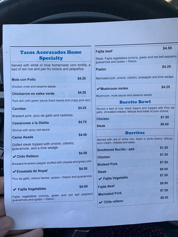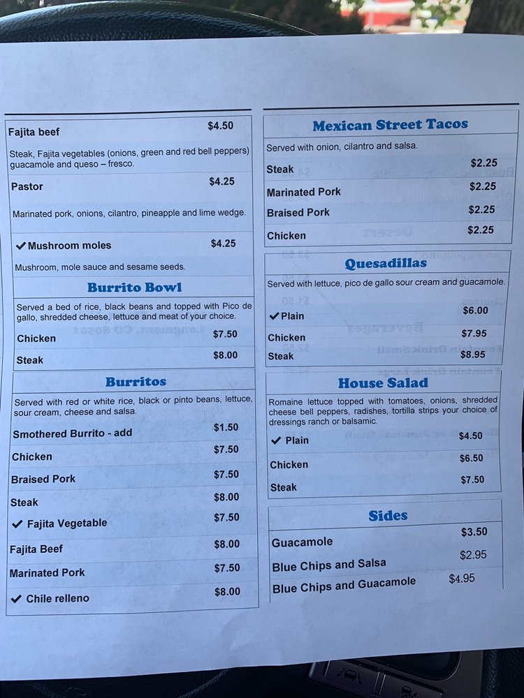 Blue Corn Tacos is a vibrant Mexican restaurant located in Longmont, CO. Offering a variety of options, including specialty tacos, burritos, and Mexican street tacos, this place is a must-try for Mexican food lovers. The menu boasts unique dishes like Mushroom Mole Taco, Fajita Vegetables Burrito, and Barbacoa Mexican Street Taco. Customers rave about the flavorful and authentic meals, such as the Carne Asada Taco and Beer Batter Fish Tacos. The restaurant provides a casual dining experience with options for delivery, takeout, and catering. With a focus on quality ingredients and friendly service, Blue Corn Tacos is a top choice for a delicious Mexican meal. Visit their location on Main St and indulge in their delectable creations.